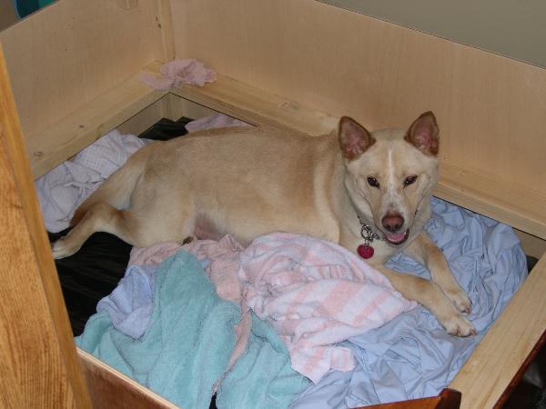Lita in her whelping box inside our bedroom closet. This is the evening