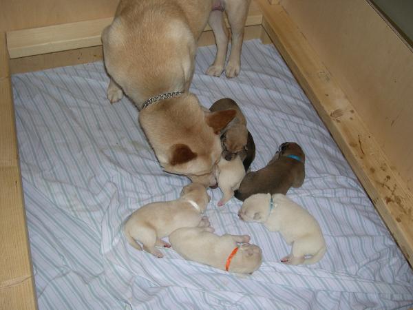Lita, being a very neat mom, is cleaning up after her very