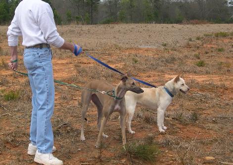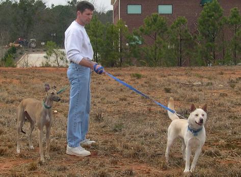 one of our Greyhounds and our Carolina Dog with us, he had