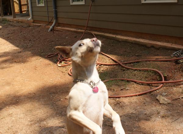 This is the epitome of suspicious. This is Lita, mid leap, after catching a dog